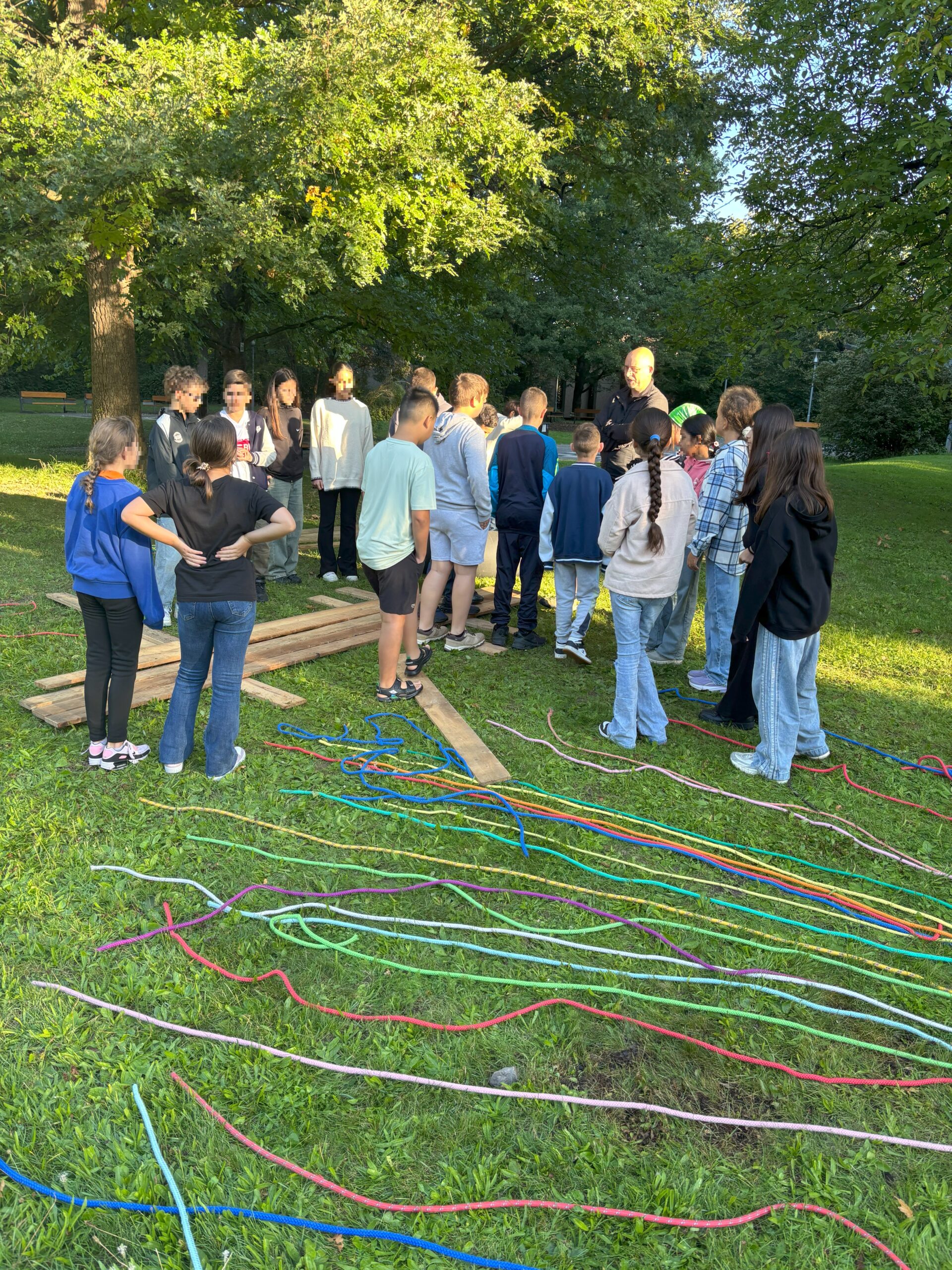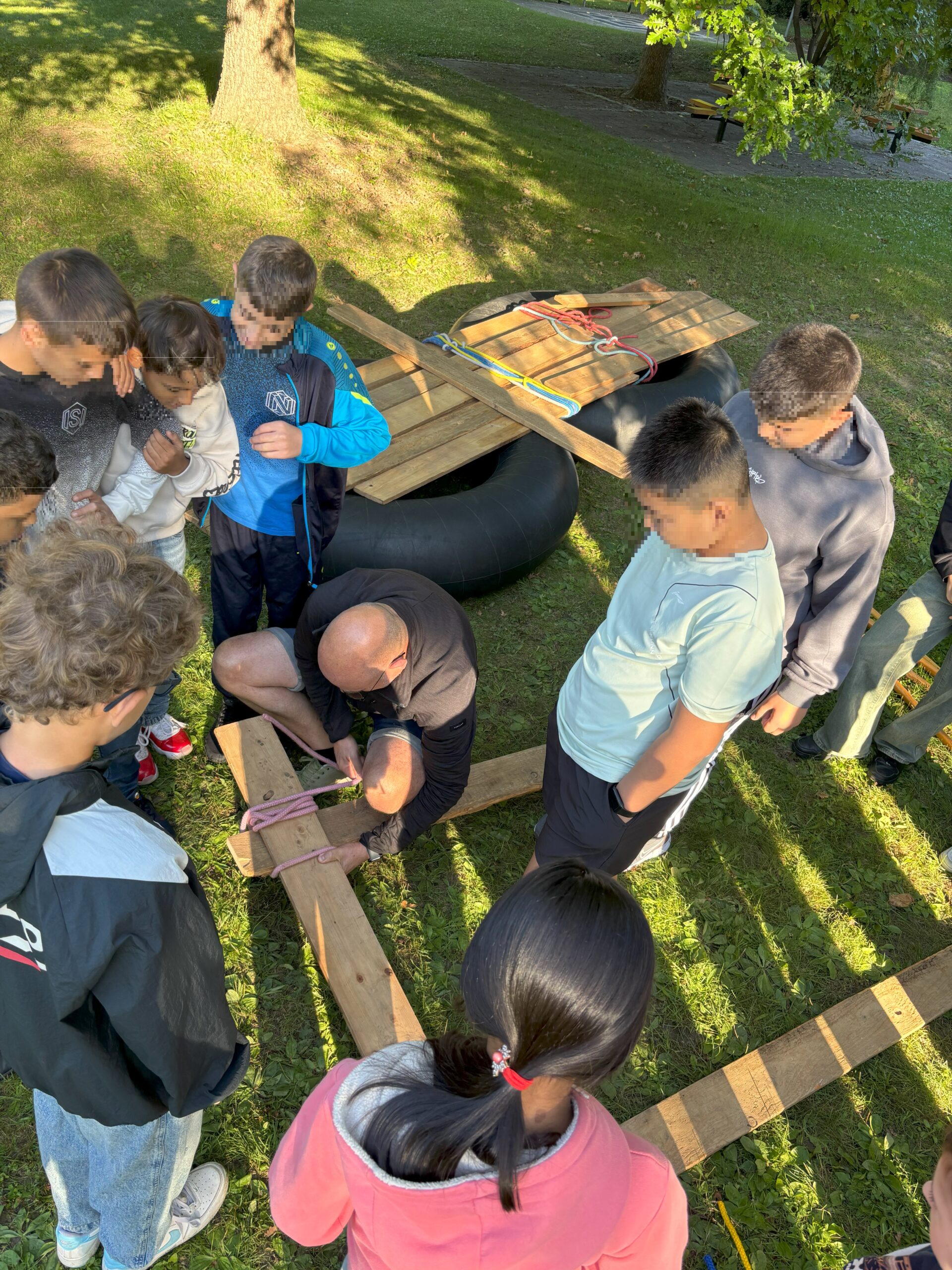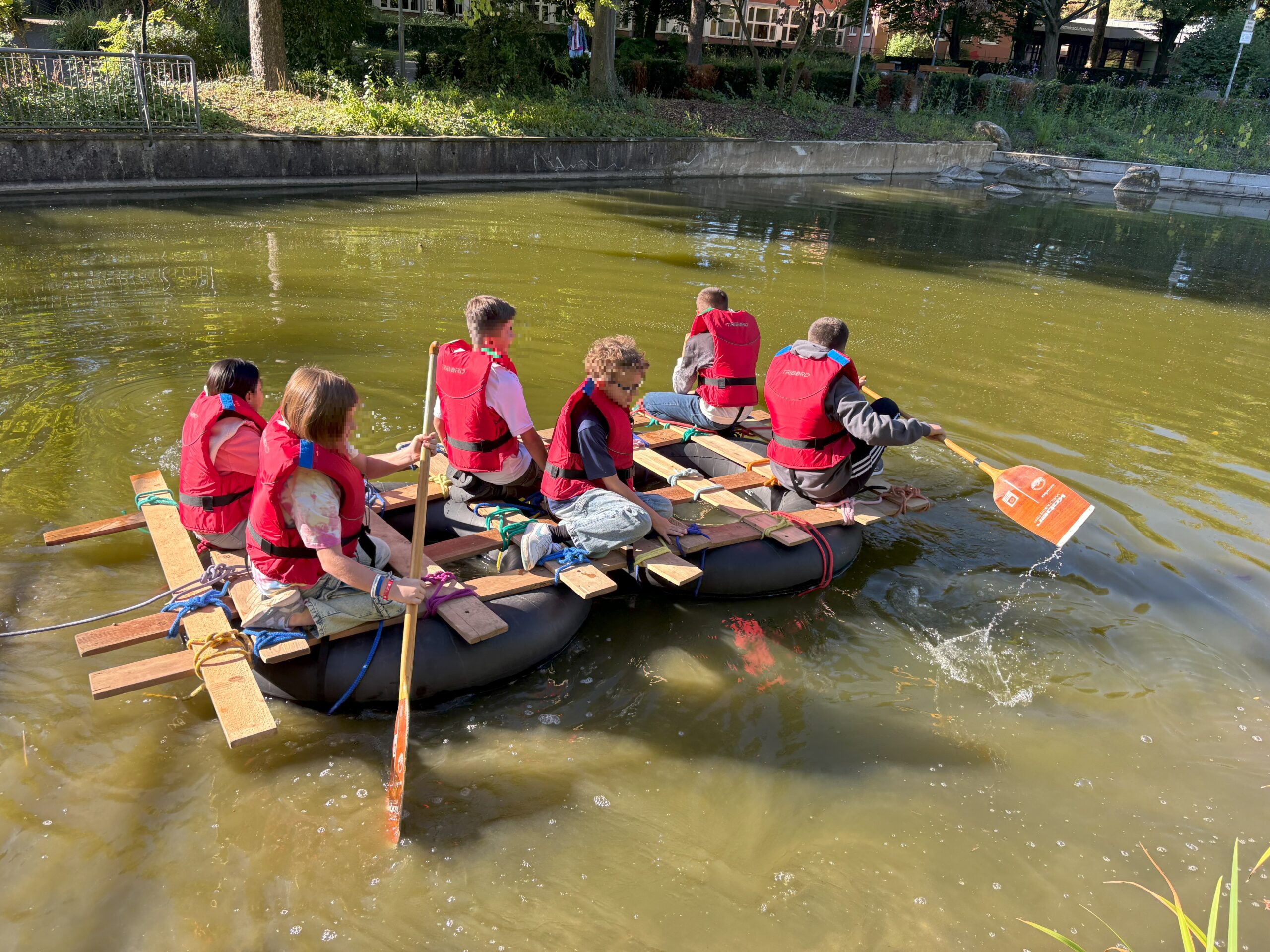 Unsere neuen Fünftklässler bauen während der Kennenlerntage am Anfang des Schuljahres gemeinsam ein Floß und testen es auf seine Funktion im See des städtischen Salamanderparks gleich nebenan.